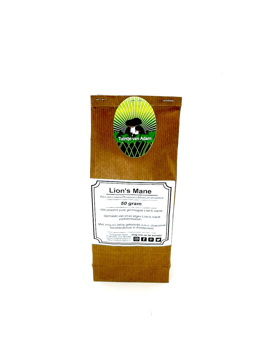 Deze verpakking heeft 100 gram aan gedroogde hele en gesneden stukken lions mane paddenstoelen. Even in lauwwarm water en na een goed uurtje zijn ze gereed om mee te koken. Tuintje van Adam heeft het hele jaar door de lions mane paddenstoelen zowel vers als gedroogd.